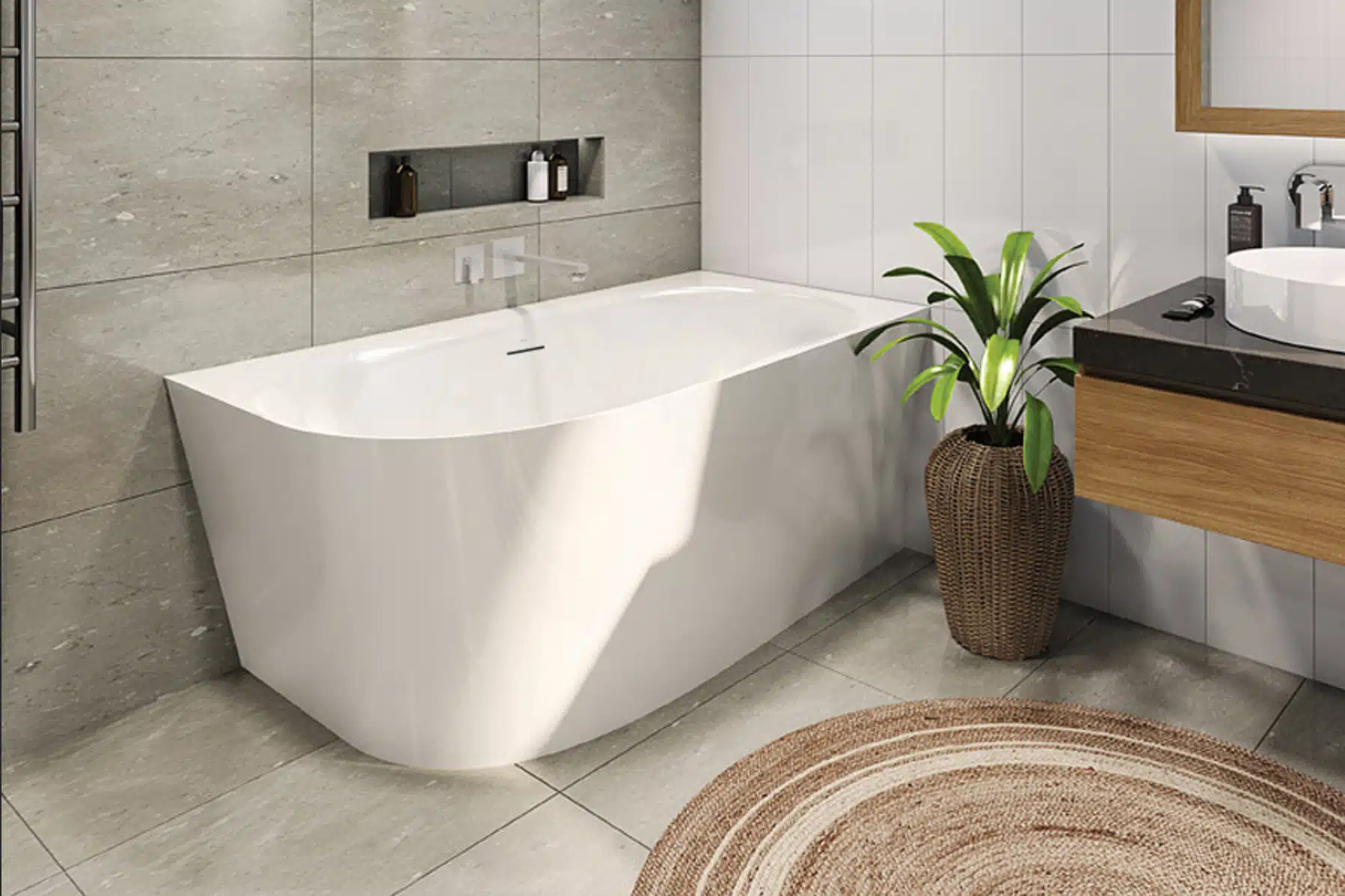Decina ‘Natalia’ Back-to-Corner Freestanding Bath is designed to fit perfectly & fully integrate into the corner of tiled bathroom with a two-sided tile bead. The Natalia is a modern, easy to install addition for small bathrooms and can be fitted into left of right positions.
