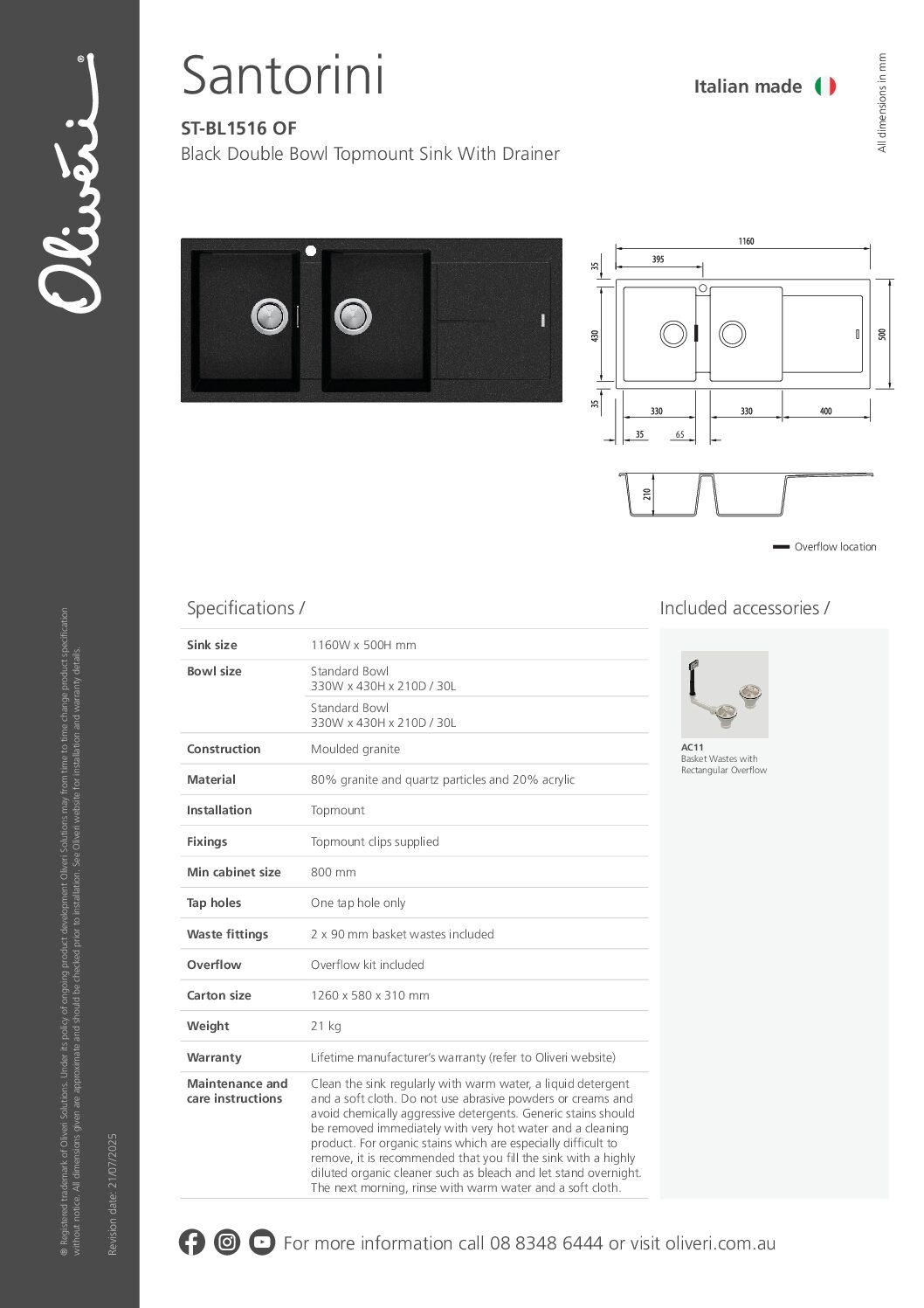 Oliveri’s granite sinks withstand thermal shocks and are heat resistant up to 280°C. We recommend using a surface protector for hot pots. This resilient sink is ready to battle your knives and forks, however if scuffing or minor scratches do appear, you can gently buff them away. The Santorini range sinks are made with Heat and Sound Insulation which allows to maintain water temperature longer, and absorbs noise.