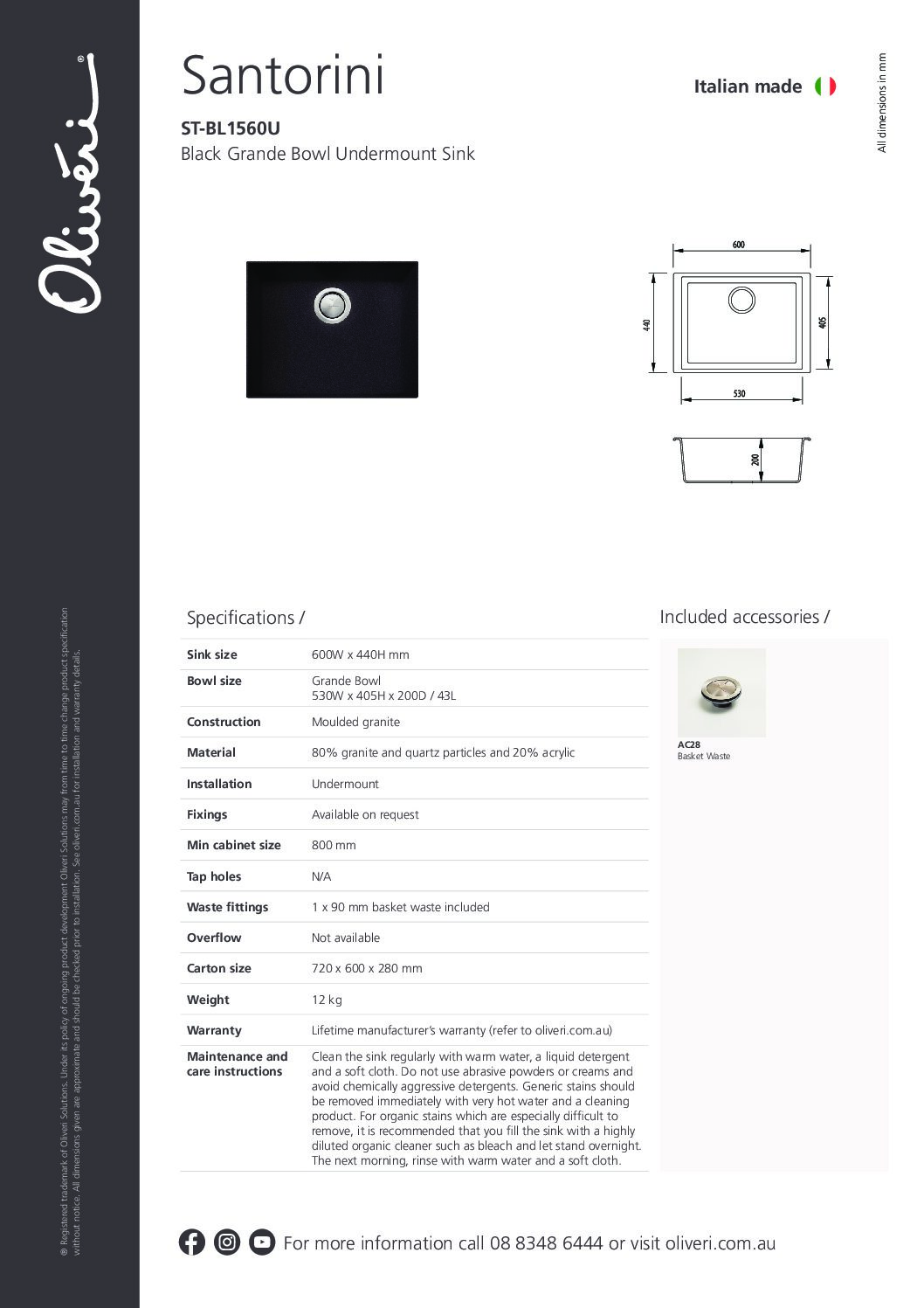 Oliveri ‘Santorini’ Grande Bowl Undermount Sink is proudly made in Italy to the highest standards and functionality. Constructed from 80% granite and quartz, 20% resin and made in Italy to ensure premium quality and reliability.