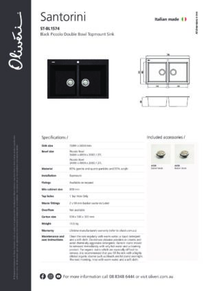 Oliveri ‘Santorini’ Piccolo Double Bowl Undermount Sink is scratch, impact and heat resistant. Made of moulded granite makes it highly practical and durable, whereas it’s beautiful look will uplift any kitchen and enhance practicality.