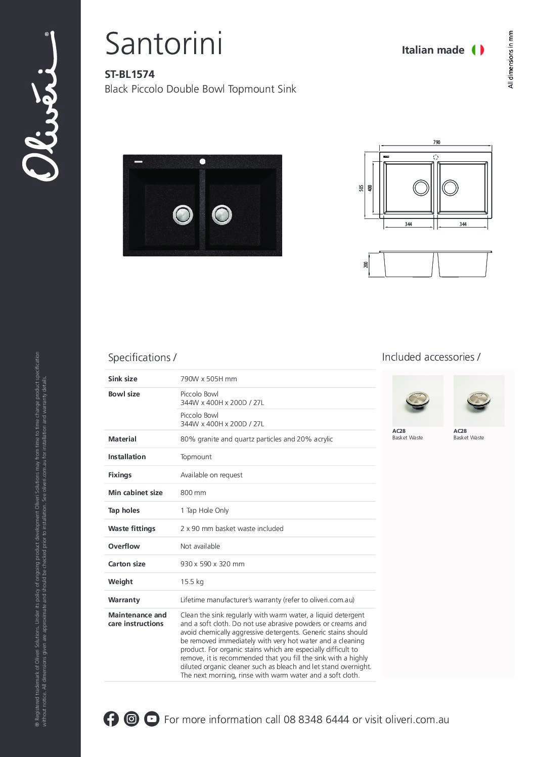Oliveri’s granite sinks withstand thermal shocks and are heat resistant up to 280°C. We recommend using a surface protector for hot pots. This resilient sink is ready to battle your knives and forks, however if scuffing or minor scratches do appear, you can gently buff them away. The Santorini range sinks are made with Heat and Sound Insulation which allows to maintain water temperature longer, and absorbs noise.