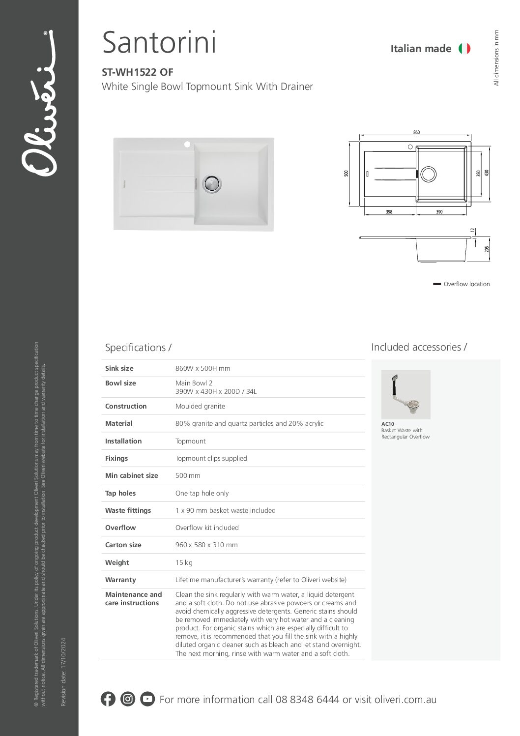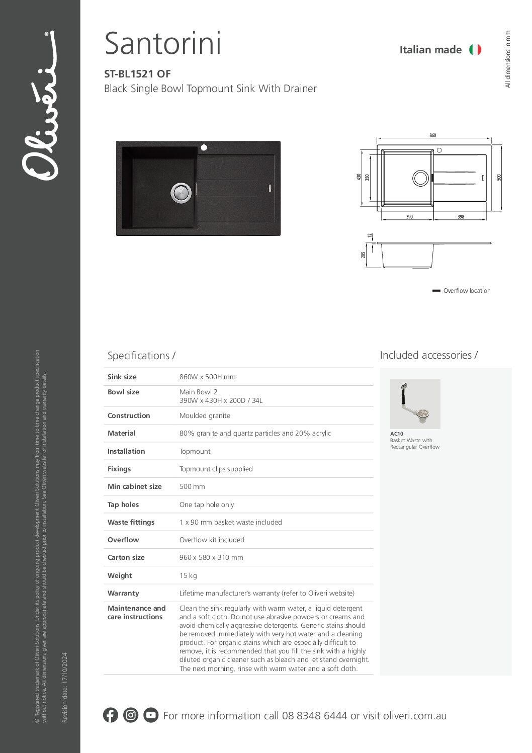 Oliveri’s granite sinks withstand thermal shocks and are heat resistant up to 280°C. We recommend using a surface protector for hot pots. This resilient sink is ready to battle your knives and forks, however if scuffing or minor scratches do appear, you can gently buff them away. The Santorini range sinks are made with Heat and Sound Insulation which allows to maintain water temperature longer, and absorbs noise.